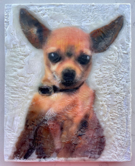 Embracing this intersection of the past and present, she carefully chooses photos and arranges their transformation by infusing them into the warm, fragrant encaustic medium.